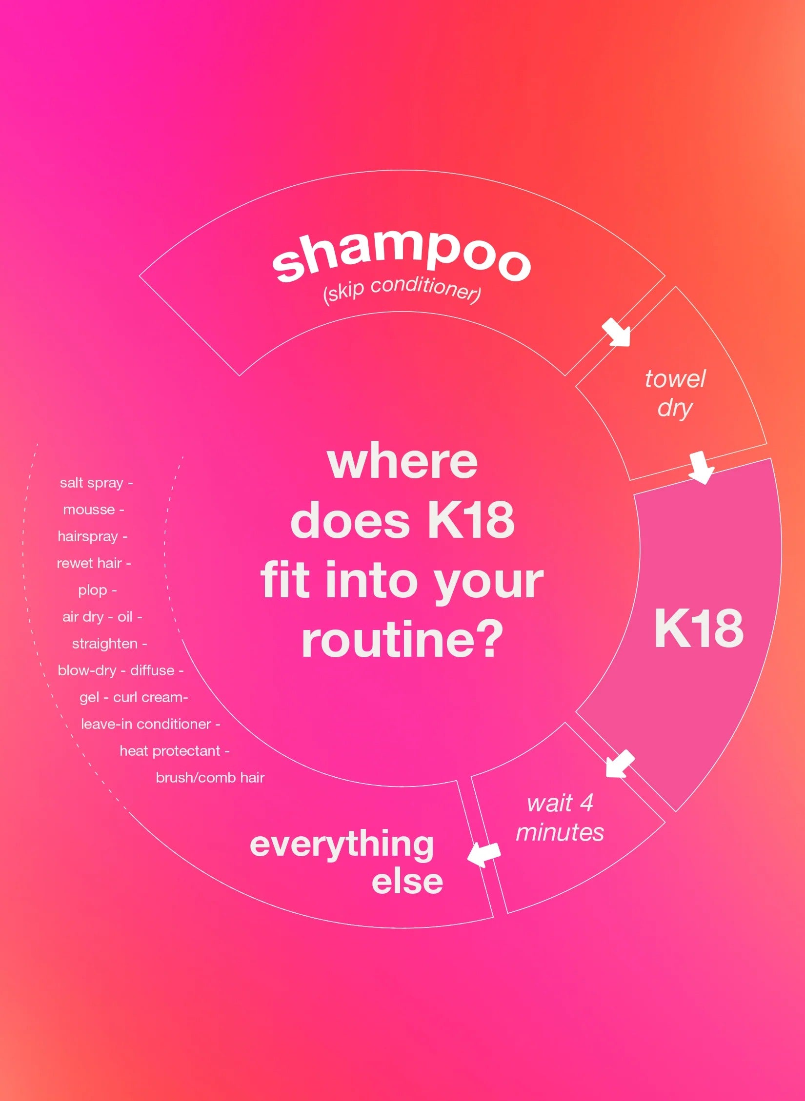 - DON'T use conditioner before applying K18 Mask (you can apply after the 4 min but most find they don’t need it).