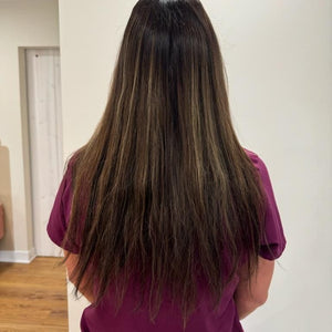 2. Apply 1-3 pumps based on your length and density, starting at the ends and working up towards the roots.